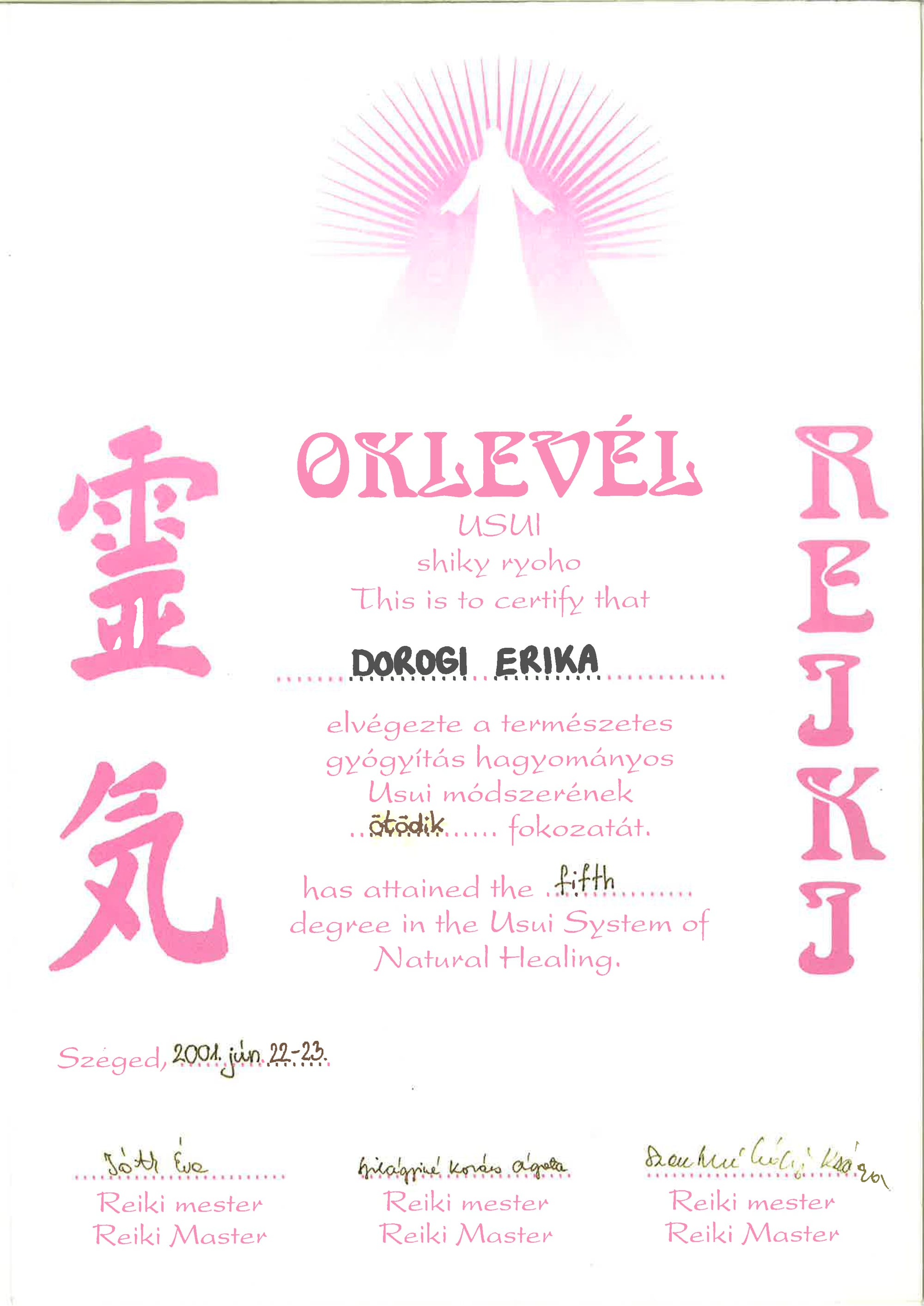 Reiki mester V. tanúsítvány